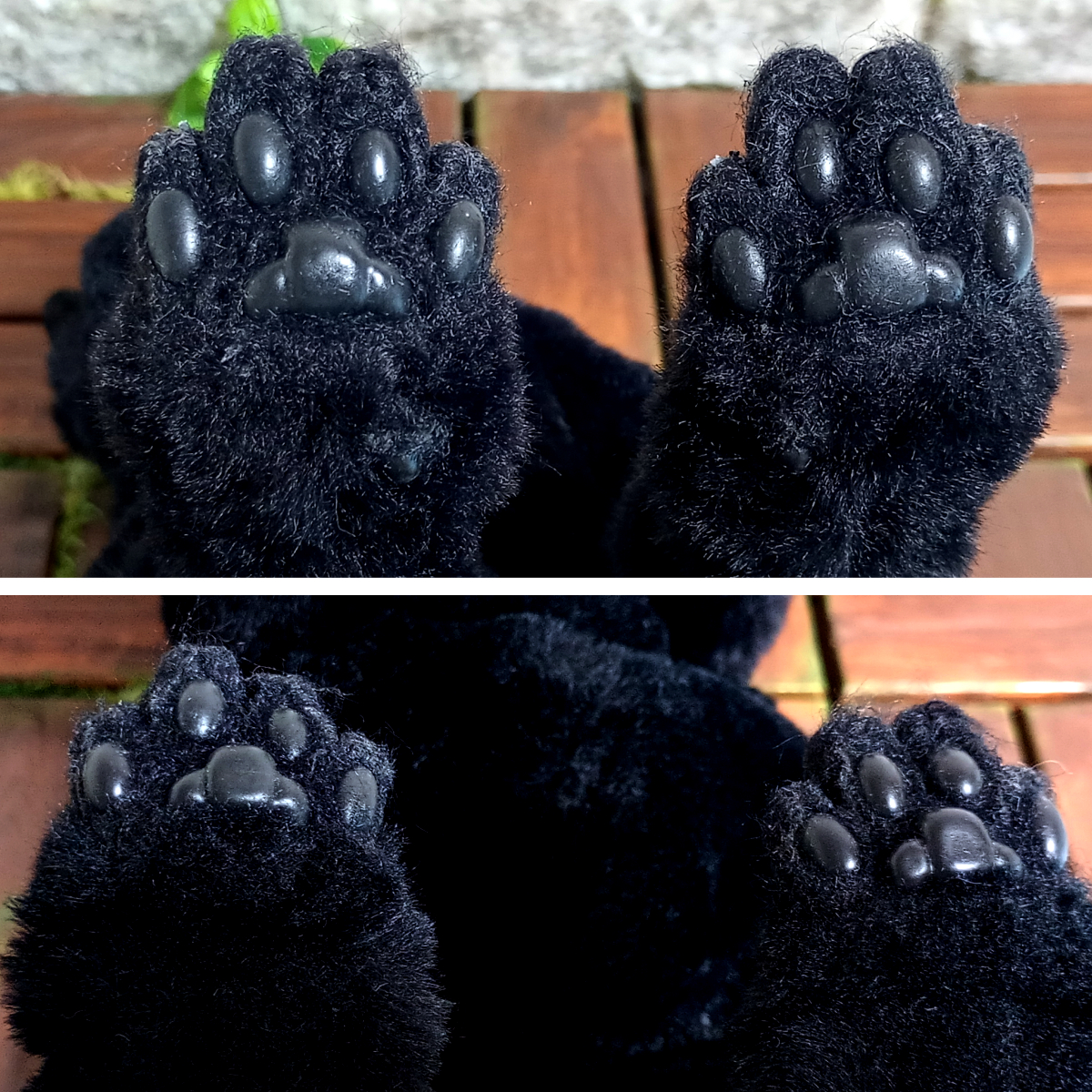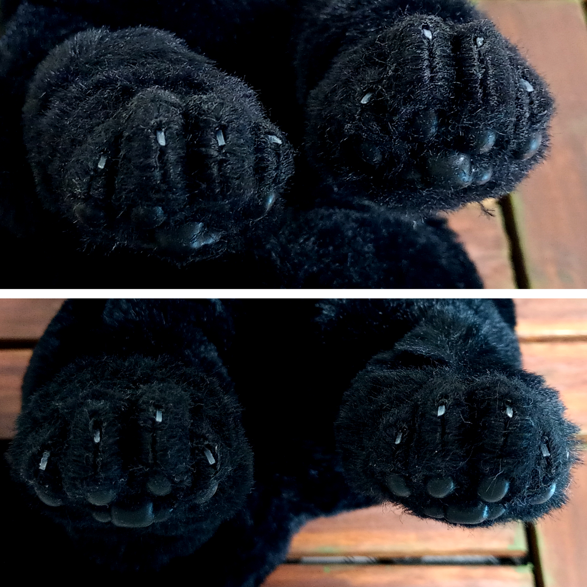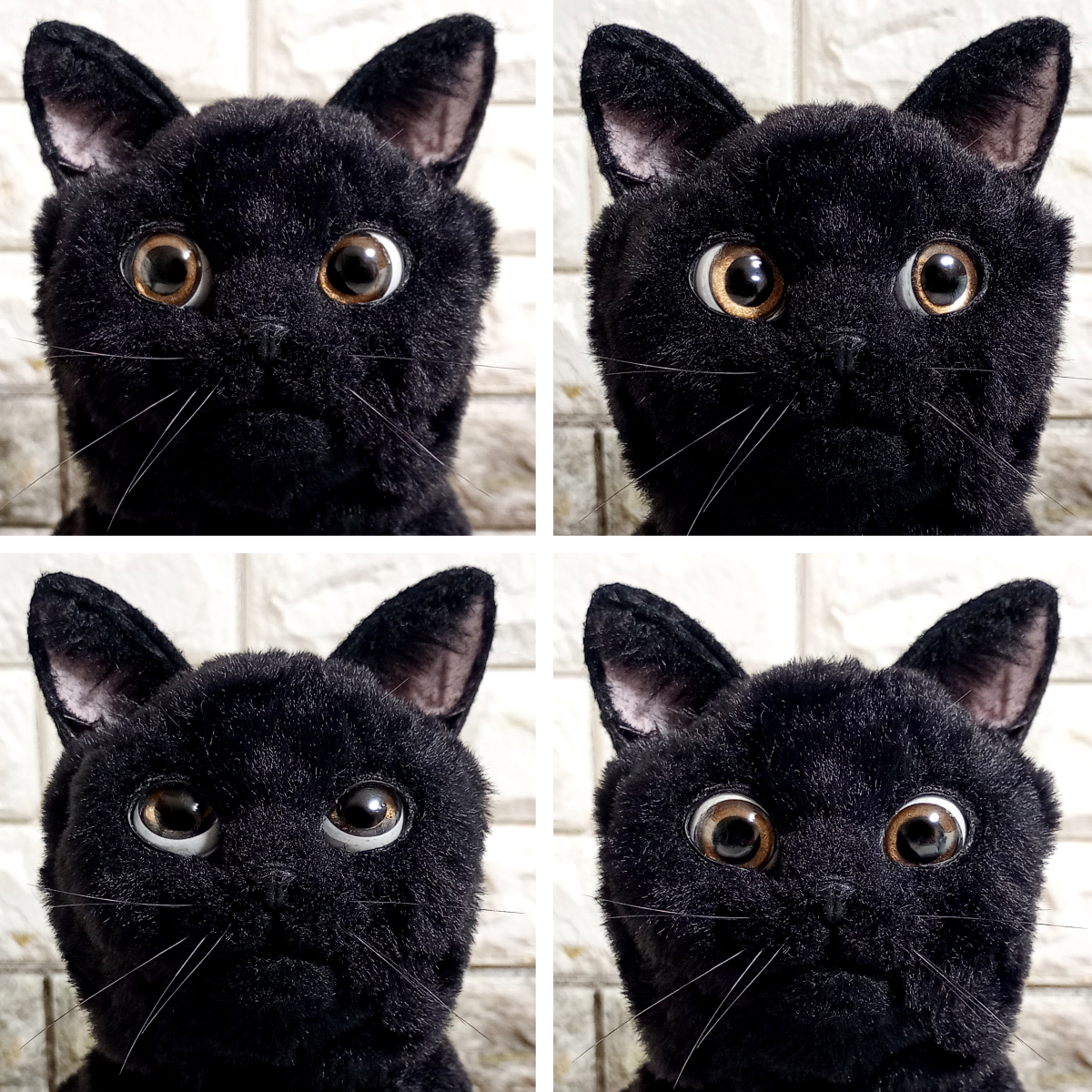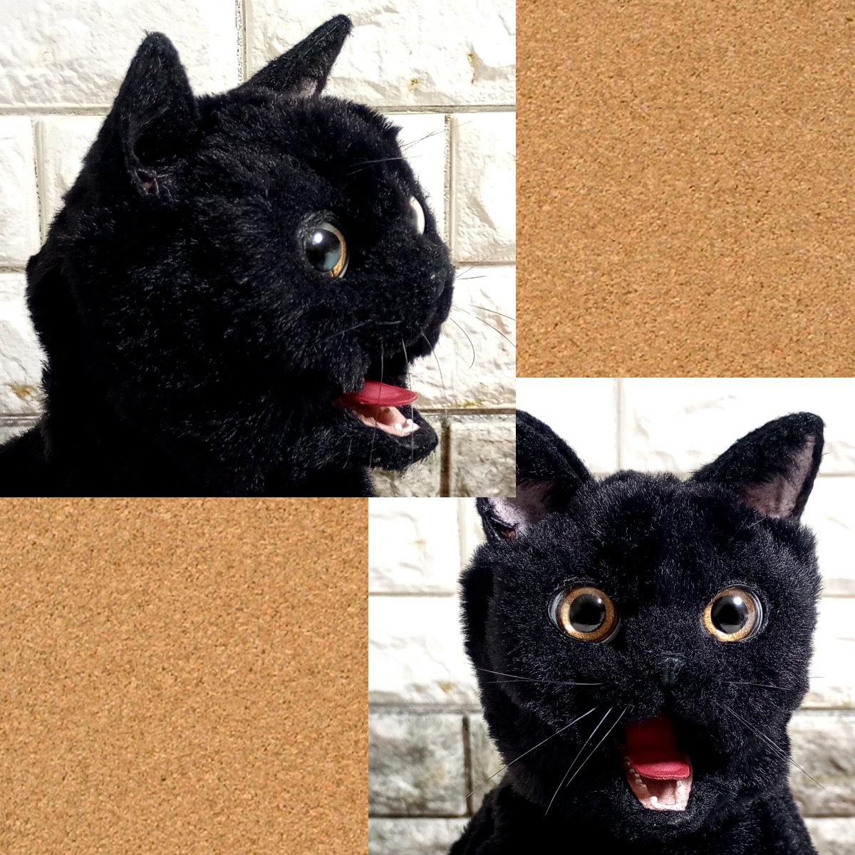 黒猫をエコファーと骨格を使って可能な限り本物そっくりな等身大の人形に仕上げました。 平均的な猫の体長を基にしており、体格は中肉中背?になっています。 全身がフル可動するアートドールです。 四肢以外では、目と耳と口と舌を動かすことができます。 視線は正面の他、左右、上下、斜めに変えることが可能です。 ただし目を閉じることはできません。 口を開くと、舌と歯があります。歯はスペースの関係で実物よりは短めです。 舌は出し入れ可能ですが、収納が難しいので出さないほうが無難です。 耳はボールジョイントで柔軟に向きを変えられます。 本物の猫ちゃんにはかないませんが、見た目もリアルに作っています。 肉球はシリコン製でプニプニとやわらかく、質感もそれらしくなっています。 前脚には親指、手根球もつけてあります。 指は1本ごと独立しており、先端には爪が生えています。 (グーの形になっており、指はのびません) 耳もシリコンで肉感があり、特徴的な付け根の袋部分も再現。 ヒゲは実際のヒゲに近い形状、質感の物を植えてあります。 鼻の表面もシリコン製で、それらしい質感になっています。 目はガラスドームを使用し、内部は実物の目に似せた立体構造となっており、 白目部分もあるので、目を可動させて視線を変えると表情が豊かになります。 エコファー使用のため、毛並みさわり心地も動物に近いモフモフ感で、 樹脂を裏打ちしてあるため、熱がこもり抱っこしていると温かみがあります。 内部の骨格は金属製ながら柔軟に変形し、針金と違って曲げた際の戻りが少なく、金属疲労で折れることがありません。 ただしアゴの可動のみ針金のため、過剰に開け閉めした場合、骨折してしまうので注意が必要です。(最大開閉で命数約50回) 構造が複雑で慣れるまでは好みのポーズにするのが大変なので電子版の説明書を参考にしてください。 素材:ポリエステルファー、スチール(骨格)、ゴム、フェルト、ガラス(目)、粘土、シリコン など 全高:約32cm 全幅:約12cm 全長(尻尾含まず):約38~40cm 尻尾:約25cm 重量:約1.4kg ※あくまで人形のため、実物と完全に同じポーズ、同じ質感ではありません。 ※可動域確保のため、へこんだり、たるんだりしている部分があります。 ※ファーの性質上、自然光と屋内照明では色味が変わります。 ※構造が複雑なため、お好みのポーズにするには慣れが必要です。 ※骨格は頑丈ですが、可動域を超えて動かした場合、故障、破損の原因になります。 ※表面のパーツ(肉球、爪、ヒゲ、鼻、耳など)は繊細なので、引っかかったり力がかかるとちぎれてしまうので優しく扱ってください。 ※関節にはゴムを使用しているので、連続して高速で動かした場合、熱で関節部分が弱くなる可能性があります。(特に夏季) ※破損、摩耗を防ぐため、ポーズを変えられる「飾り」としてお使いいただくことをおすすめします。 ※重量があるため、高い場所への展示は落下の危険性があります。 ※尖った部品は露出していませんが、ガラスや金属部品を使用しているため、小さなお子様や動物との接触は避けてください。 ※ソフトファーという種類のエコファーを使用しており、ファーが絡みやすいため、クシやハブラシでお手入れしてください。 ※ファーは汚れが付きやすいため屋内のホコリのない場所に飾ってください。 ※シリコン部分(耳、鼻、肉球)は静電気でホコリが付きやすいです。セロハンテープでホコリを簡単に除去できます。 ※脱毛が服に着きやすいので洗濯困難な服ではさわらないようにしてください。 ※本物の猫さん同様、水が苦手です。(内部骨格のサビ、ファーの汚れ・カビ、接着材の分解が起こります) ※暑さも苦手です。高温多湿、長時間の直射日光は避けてください。関節部が劣化する恐れがあります。 ※肉球が地面に接触したままの場合、材質により肉球と癒着してしまう場合があります。長時間飾る、保管する場合は寝かせてください。 ※耳やヒゲは長時間変形したままだと、クセがついてしまいます。保管の際はスペースを確保してください。