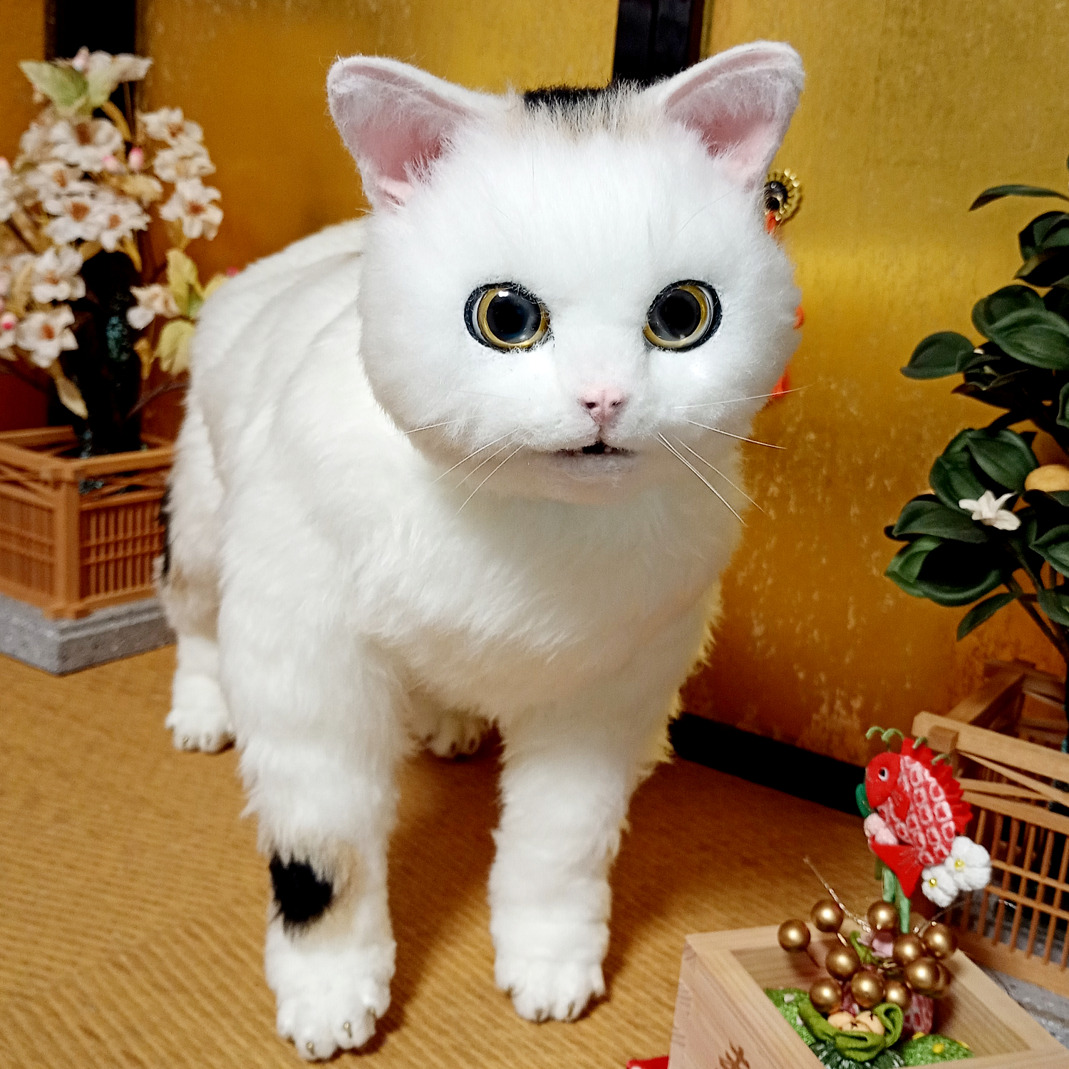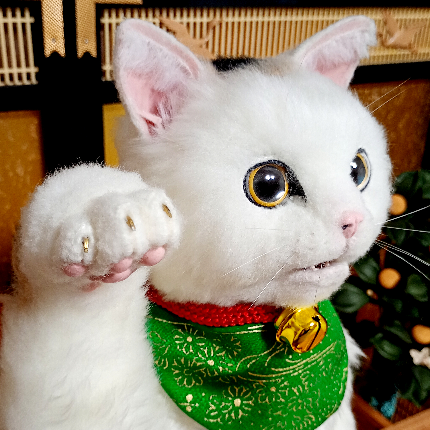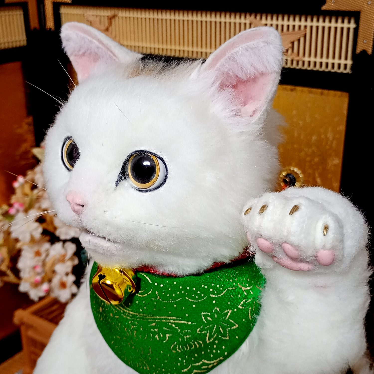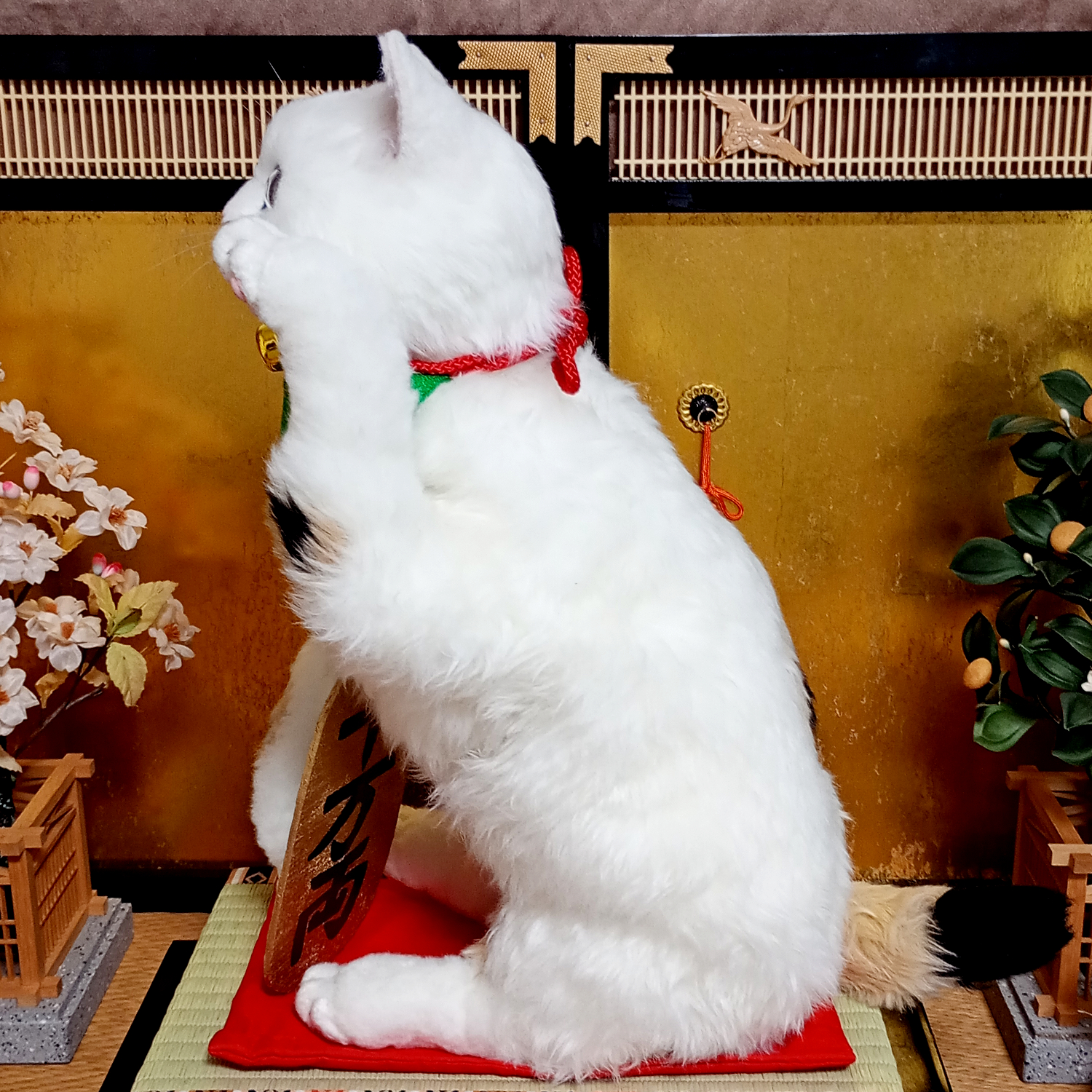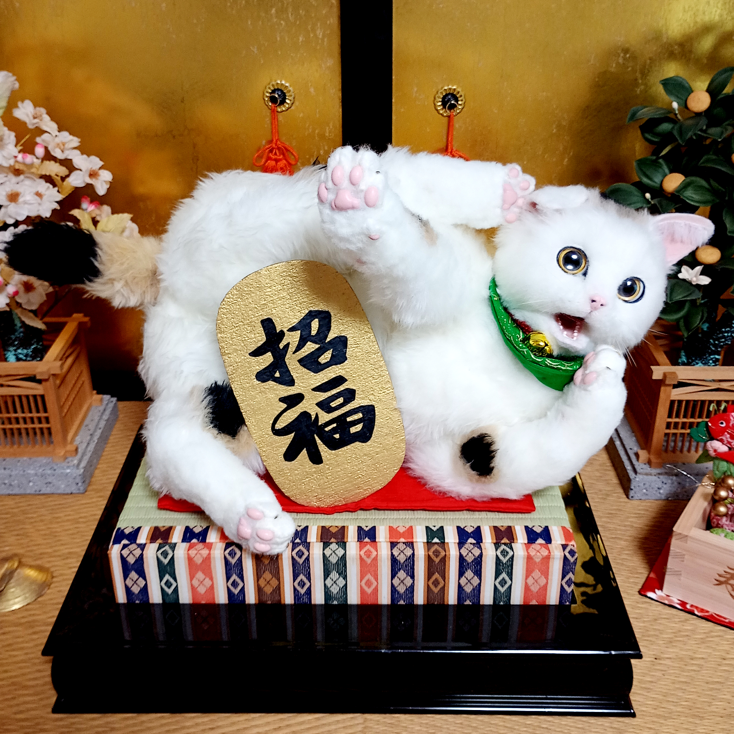 自在に可動できる三毛猫の等身大アートドール。 リアルな招き猫にしあげるために柄も招き猫のような特徴的な楕円の柄にしました。 爪も同様に縁起のよさそうな金色とし、お目目もまんまるな金色でフチは黒色としました。 尻尾は細長いボブテイルです。 小判と鈴の首輪、緑の前掛けといった小道具も再現。 右の手で招くのは富で小判は「千万両」 左の手で招くのは人で小判は「招福」となっています。