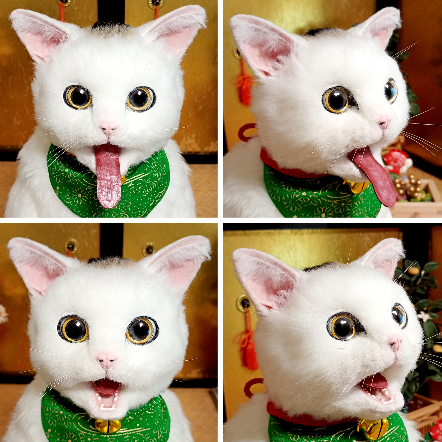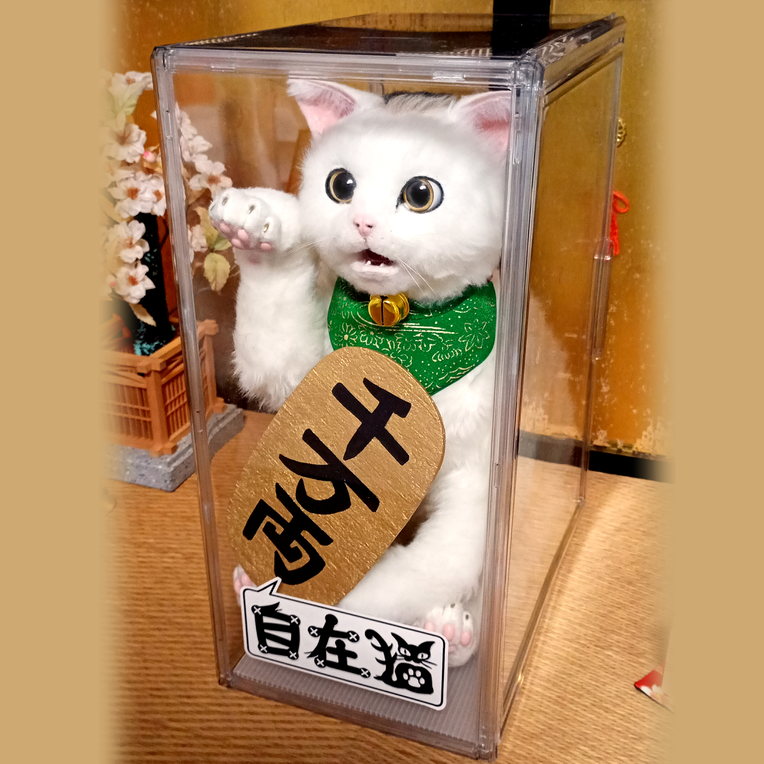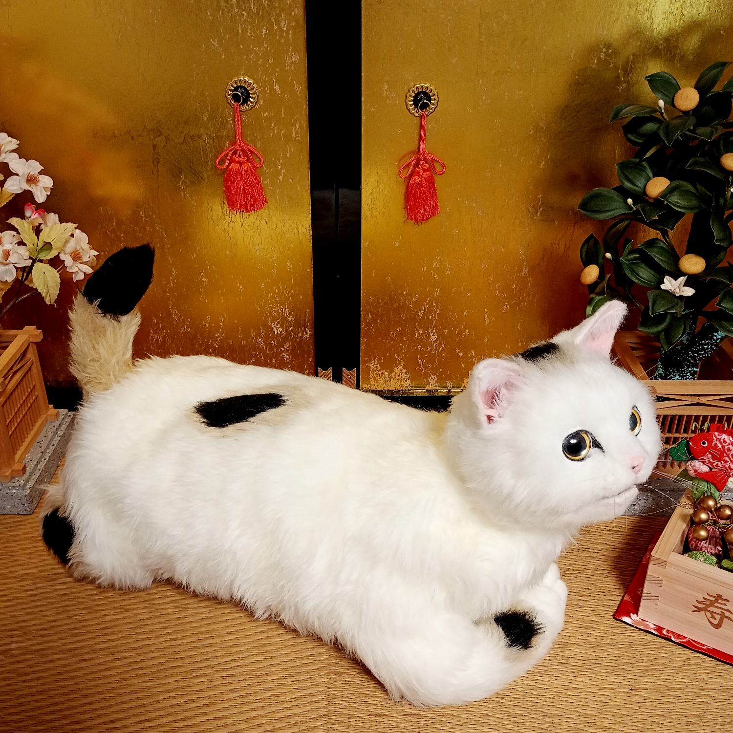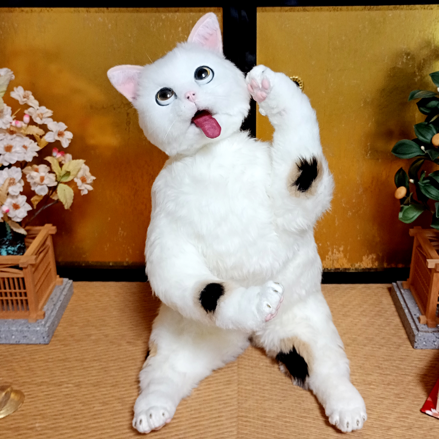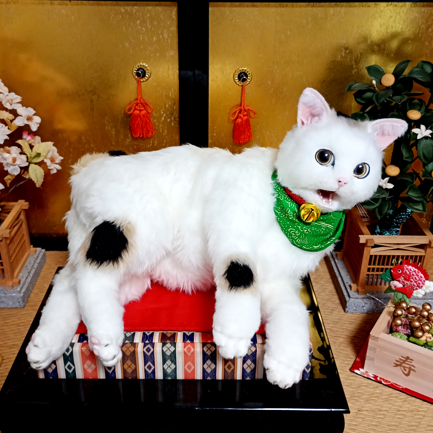 自在に可動できる三毛猫の等身大アートドール。 リアルな招き猫にしあげるために柄も招き猫のような特徴的な楕円の柄にしました。 爪も同様に縁起のよさそうな金色とし、お目目もまんまるな金色でフチは黒色としました。 尻尾は細長いボブテイルです。 小判と鈴の首輪、緑の前掛けといった小道具も再現。 右の手で招くのは富で小判は「千万両」 左の手で招くのは人で小判は「招福」となっています。