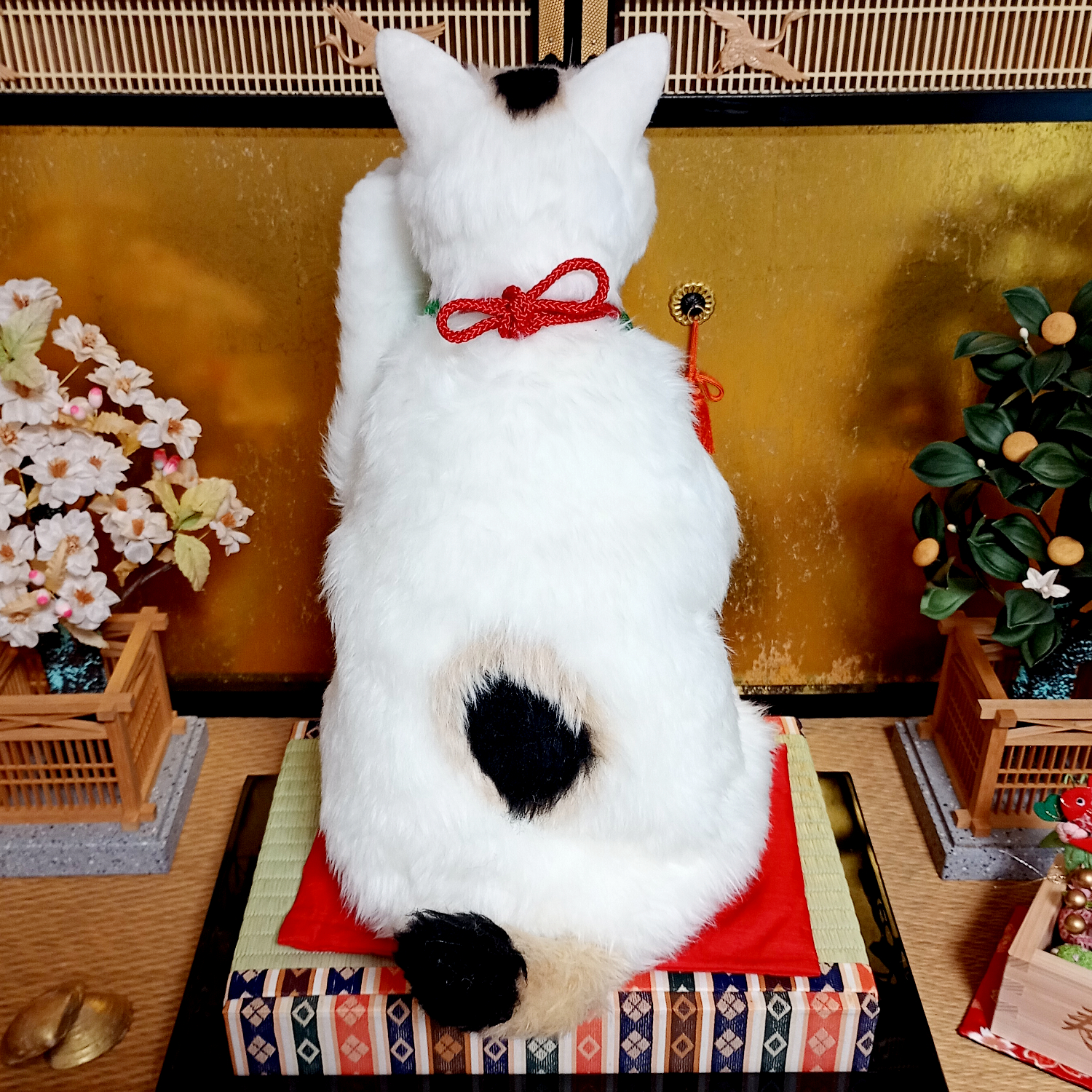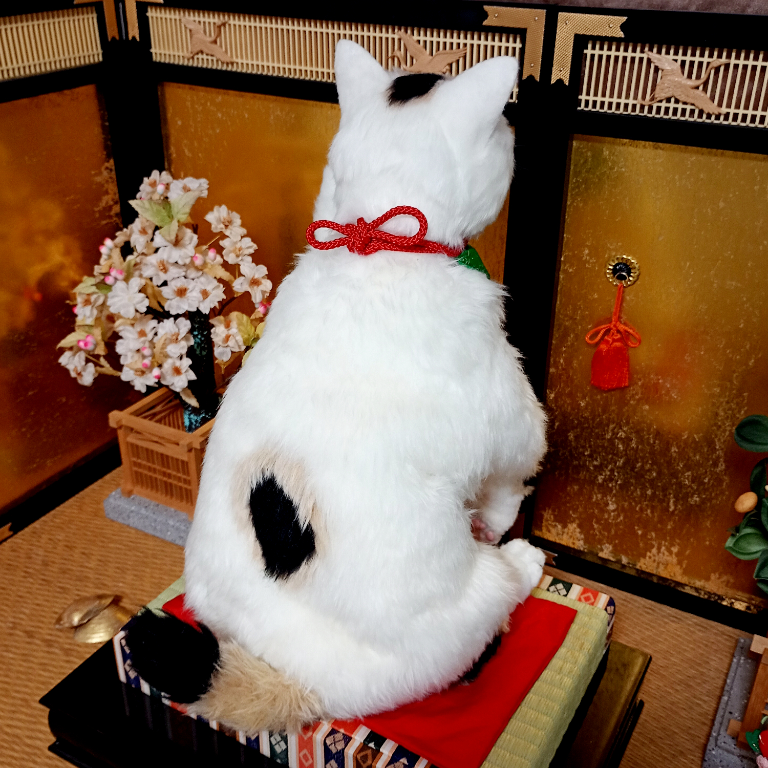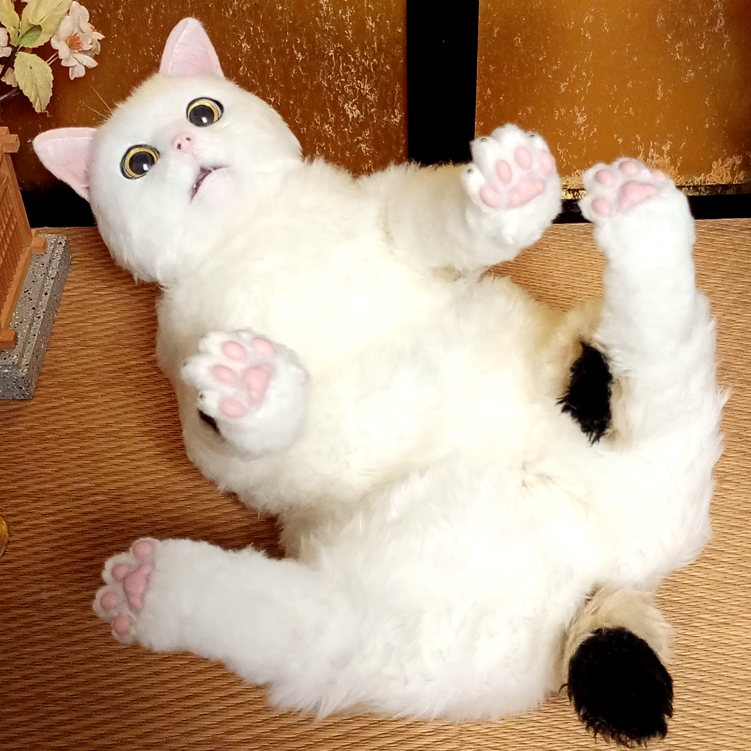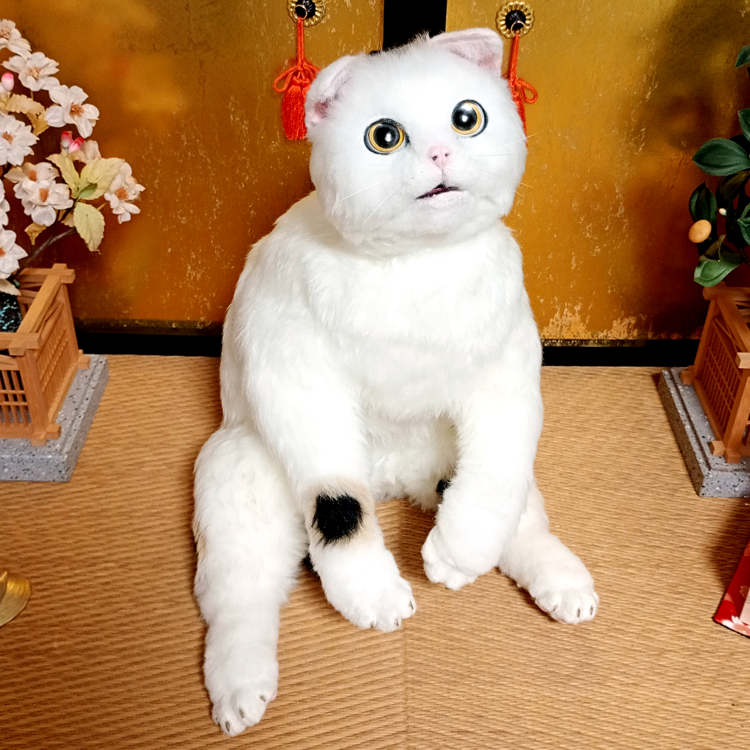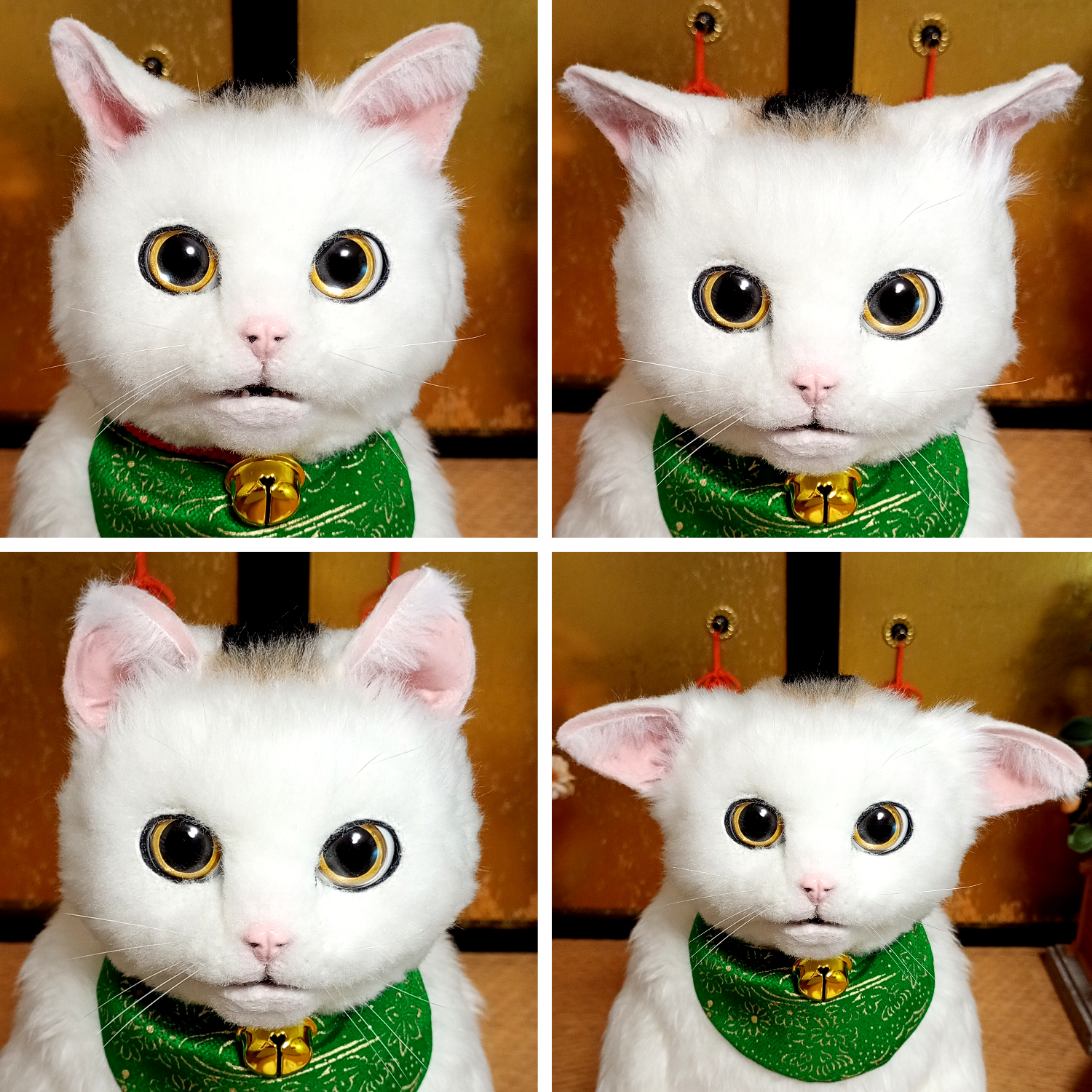 自在に可動できる三毛猫の等身大アートドール。 リアルな招き猫にしあげるために柄も招き猫のような特徴的な楕円の柄にしました。 爪も同様に縁起のよさそうな金色とし、お目目もまんまるな金色でフチは黒色としました。 尻尾は細長いボブテイルです。 小判と鈴の首輪、緑の前掛けといった小道具も再現。 右の手で招くのは富で小判は「千万両」 左の手で招くのは人で小判は「招福」となっています。