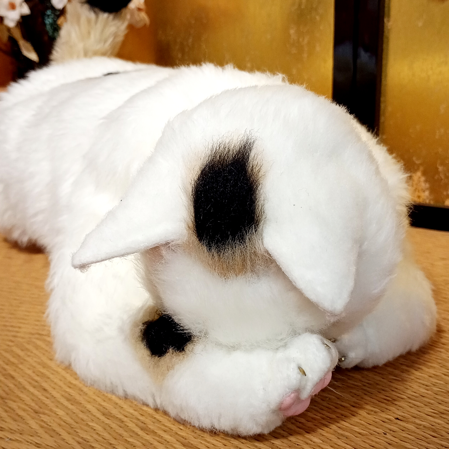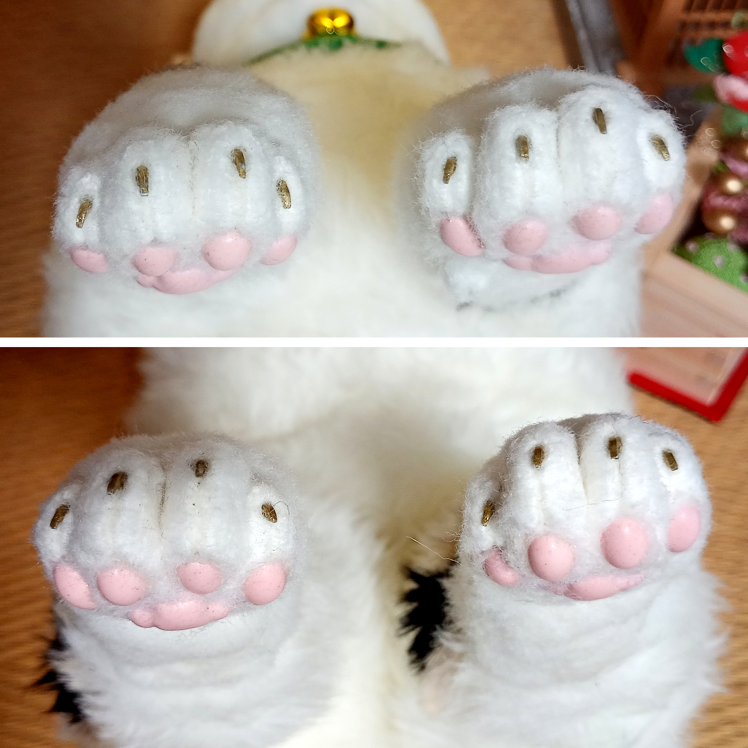 フェイクファーと特殊な骨格を使って可能な限り本物そっくりに仕上げた全身フル可動のリアルドールです。 平均的な猫の体長を基にしており、体格は中肉中背?になっています。 招き猫のような柄の三毛猫に仕上げて、小判や鈴、前掛けをつけました。 縁起のよさそうな猫ちゃんなので、商売繁盛の看板猫にピッタリです。 本作は自家用、レンタル用のため展示のみです。 四肢以外では、目と耳と口と舌を動かすことができます。 視線は正面の他、左右、上下、斜めに変えることが可能です。 ただし目を閉じることはできません。 口を開くと、舌と歯があります。歯はスペースの関係で実物よりは短めです。 舌は出し入れ可能ですが、収納が難しいので出さないほうが無難です。 耳はボールジョイントで柔軟に向きを変えられます。 本作はスコティッシュフォールドのように耳を折りたたんだり、耳を反らしたり、細め、幅広とお好みの形に変形できます。 本物の猫ちゃんにはかないませんが、見た目もリアルに作っています。 肉球はシリコン製でプニプニとやわらかく、質感もそれらしくなっています。 前脚には親指、手根球もつけてあります。 指は1本ごと独立しており、先端には爪が生えています。招き猫なので縁起のよい金色です。 耳もシリコンで肉感があり、特徴的な付け根の袋部分も再現。 ヒゲは実際のヒゲに近い形状、質感の物を植えてあります。 鼻の表面もシリコン製で、それらしい質感になっています。 目はガラスドームを使用し、内部は実物の目に似せた立体構造となっており、 白目部分もあるので、目を可動させて視線を変えると表情が豊かになります。 ソフトなフェイクファー使用のため、毛並みさわり心地も動物に近いモフモフ感で、 樹脂を裏打ちしてあるため、熱がこもり抱っこしていると温かみがあります。 内部の骨格は金属製ながら柔軟に変形し、針金と違って曲げた際の戻りが少なく、金属疲労で折れることがありません。 ただしアゴの可動のみ針金のため、過剰に開け閉めした場合、骨折してしまうので注意が必要です。(最大開閉で命数約50回) 構造が複雑で慣れるまでは好みのポーズにするのが大変なので電子版の説明書を参考にしてください。 全高:約32cm 全幅:約12cm 全長(尻尾含まず):約38~40cm 尻尾:約12cm 重量:約1.4kg(衣装ふくまず) 素材:ポリエステルファー、スチール(骨格)、ゴム、フェルト、ガラス(目)、粘土、シリコン など ※あくまで人形のため、実物と完全に同じポーズ、同じ質感ではありません。 ※可動域確保のため、へこんだり、たるんだりしている部分があります。 ※ファーの性質上、自然光と屋内照明では色味が変わります。着色部は色移りがあります。 ※構造が複雑なため、お好みのポーズにするには慣れが必要です。 ※骨格は頑丈ですが、可動域を超えて動かした場合、故障、破損の原因になります。 ※表面(肉球、爪、ヒゲ、鼻、耳など)は繊細なので、引っかかったり力がかかるとちぎれてしまうので優しく扱ってください。 ※関節はゴムを使用しているので、連続して高速で動かした場合、熱で関節部分が弱くなる可能性があります。(特に夏季) ※破損、摩耗を防ぐため、ポーズを変えられる「飾り」としてお使いいただくことをおすすめします。 ※重量があるため、高い場所への展示は落下の危険性があります。 ※尖った部品は露出していませんが、ガラスや金属を使用しているため、小さなお子様や動物との接触は避けてください。 ※ソフトファーという種類のエコファーを使用しており、ファーが絡みやすいため、クシやハブラシでお手入れしてください。 ※ファーは汚れが付きやすいため屋内のホコリのない場所に飾ってください。 ※シリコン部分(耳、鼻、肉球)は静電気でホコリが付きやすいです。セロハンテープでホコリを簡単に除去できます。 ※脱毛が服につきやすいので洗濯困難な服ではさわらないようにしてください。 ※本物の猫さん同様、水が苦手です。(内部骨格のサビ、ファーの汚れ・カビ、接着材の分解が起こります) ※暑さも苦手です。高温多湿、長時間の直射日光は避けてください。関節部が劣化する恐れがあります。 ※肉球が地面に接触続けると、材質により肉球と癒着する場合があります。長時間飾る、保管する際は寝かせてください。 ※耳やヒゲは長時間変形したままだと、クセがついてしまいます。保管の際はスペースを確保してください。